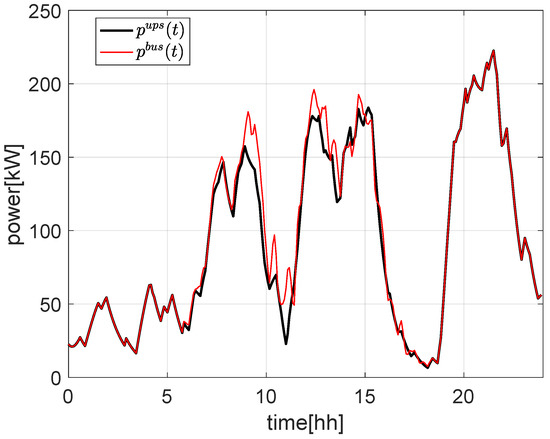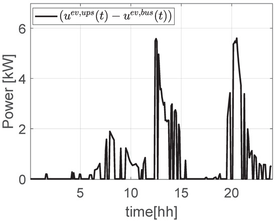As is possible to see from Figure 12, the power profile delivered to the PEVs slightly changes from the BUS to the UPS configurations, due to the fact that the cost c ( t ) (which weighs the power tracking term) also depends on x ( t ) , which is subject to the uncertainties of w ( t ) for the UPS configuration. A detailed comparison of the power profiles u e v ( t ) in the two configurations can be found in Figure 13, where it is possible to see that the UPS configuration provides slightly more power to the charging PEVs with respect to the BUS configuration. Moreover, the UPS configuration benefits of decoupling the power profile at the POC p ( t ) from the uncertainties.