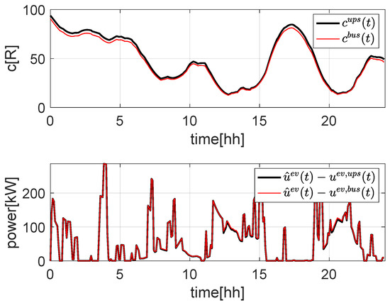 Figure 12. Comparison between power delivered to PEVs (bottom) and variable cost c ( t ) (top) for BUS and UPS configurations.