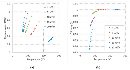 Results for the DBHE. (a) Thermal power vs. outlet temperature and (b) efficiency vs. outlet temperature.