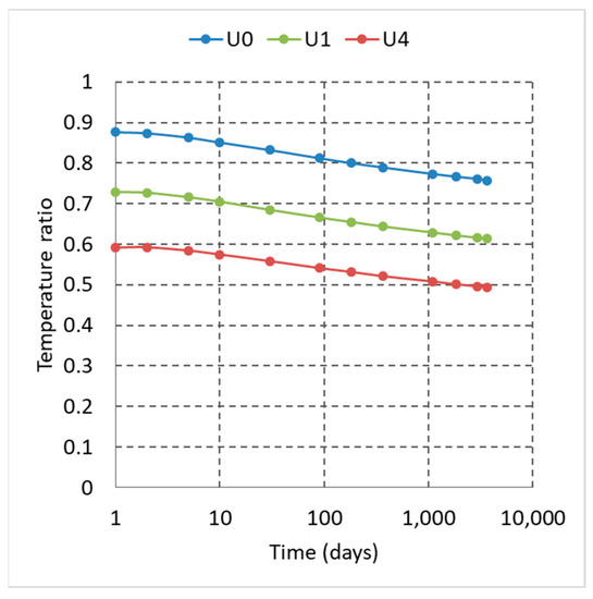 The comparison between the two analysed configurations refers to the results after six months from the startup. Figure 12 shows the evolution of the outlet temperature with increasing flow rate; the different behaviour highlights a continuous temperature decrease for the DBHE and a pseudo-constant value for the ULHE (U0, U1, U4). Considering the same exchange length, the DBHE produces a higher temperature than the ULHE. This result is due to the higher depth and, thus, higher temperature attained with the DBHE. Moreover, comparing the ULHE configuration (U10) achieving the same depth as the DBHE, the observed behaviour is different. The DBHE presents a lower exit temperature for a more significant part of the flow rates. This lower temperature is related to the larger well contact area as reported by Beckers et al. [36].