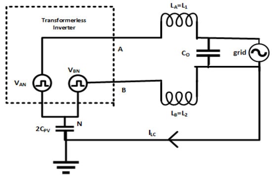 Figure 2 shows the parts of a single phase grid-connected PV system with a transformerless inverter. When a transformerless inverter is connected to the PV and the grid, the leakage current is its primary concern. The leakage current flowing path is identified in Figure 3. The output terminals, A and B, of the transformerless inverter generate the pulsed voltage source VAN and VBN, respectively. They are the main sources of leakage current that flows through the grid to the PV that is shown in Figure 4. The effect of filter inductance remains active, but the effect of the filter capacitor and grid may be neglected [72,73]. Then the final common mode model is shown in Figure 5. The total common mode voltage (VtCM) is the final combined source of leakage current (ILC) that flows through the filter inductance and parasitic capacitance (CPV) of the PV.