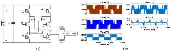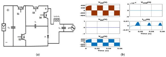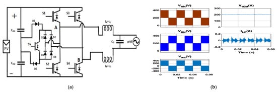 An improved H6 topology was proposed in [37]. In Figure 8a, the topology is shown, and Figure 8b shows the simulation results of this topology. The H5 topology was modified by adding an extra switch in the neutral side of the PV panel to lower the leakage current compared to that of the H5 topology. Here, the left bridge side was operated on the line frequency and right bridge side on the switching frequency. The disconnecting switches were kept on for a half cycle in an alternate manner to avoid more switching loss. The merits of the topology are lower THD and lower leakage current than that of the H5 obtained by simulation. However, the total common mode voltage swung between 0 V and 400 V with a different nature from H5, the peak leakage current was around 150 mA, and the computed efficiency was lower than that of H5 due to the increased number of switches.