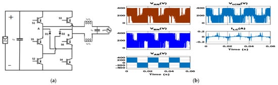 The OH5 topology was proposed in [46]. The topology is shown in Figure 13a, and Figure 13b demonstrates the simulation results of this topology. The upper two switches of the bridge were selected for free-wheeling mode current flowing. The total common mode voltage was now roughly constant at 200 V due to the effective use of switch S6 in the zero state or free-wheeling mode. However, because both the inductor and the capacitor impact leakage current, when the first half of the cycle was ignored, simulation results showed a continuous leakage current of 65.05 mA without a peak. However, this topology’s efficiency was the lowest among those in this category due to the running of more switches at the switching frequency.