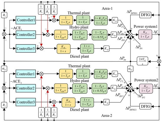 The massive use of fossil fuels is an essential factor in global warming. To cope with the increasingly severe environmental and climate problems, governments are exploring the development path of renewable energy sources []. Wind power, a common type of renewable energy, has been strongly developed for its environmental friendliness and economy [,]. However, as the renewable power represented by wind power joins the grid, the penetration of renewable energy gradually increases while reducing the load frequency control (LFC) capability of the power system []. However, it is well known that frequency is critical in the stable running of a power system, and severe system frequency fluctuations and deviations can adversely affect the users within the power system []. So, it is vital to design an efficient load frequency controller to ensure that the power system frequency is maintained in a safe range [,].
