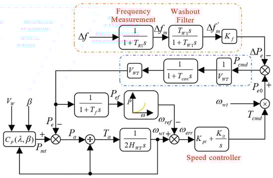 The additional frequency response of the wind turbine consists of three parts: frequency measurement module, washout filtering module, and droop control, where the transfer function of the frequency measurement module is given by