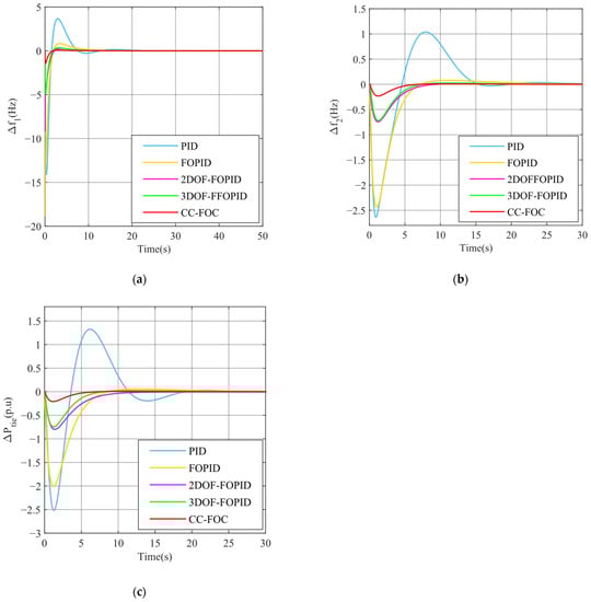 Dynamic performance under Area 1 2% load disturbance (a) , (b) , and (c) .