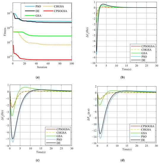 The iterative process of the various algorithms is reflected in Figure 10a, and it can be seen that CPSOGSA converges faster than the other four algorithms and has a smaller fitness value, i.e., the controller parameters found are better. However, the convergence speed and fitness value of PSO and GSA could be more satisfactory and even fall into the local optimum. Figure 10b–d show the frequency variation curves of the regional interconnected power system and the dynamic response curves of the contact line power deviation obtained by different algorithms for the cascade controller when the interconnected regional system faces the same disturbances. From the dynamic response results of the system, it is known that the cascade controller under CPSOGSA optimization exhibits better system frequency control capability.