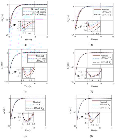 The robustness of the load frequency controller is important for the system, so this subsection will reflect the robustness of the proposed cascade controller by varying the load perturbation and system parameters in a simulation environment for sensitivity analysis. The load perturbation circumstances and system parameters are altered between +25% and −25% of their nominal values in the simulated evaluation of the controller resilience. Figure 11 shows the frequency dynamic response of area 1 under varying load disturbance and system parameters such as the time constant of the hydropower plant (), frequency bias parameter (), droop governor characteristic (), stiffness coefficient (), and power system time constant (). From Figure 11a,b, we can learn that the load disturbance and the system parameter have some influence on the stabilization of the system frequency, among which the influence of the load disturbance change is the most obvious, but the LFC performance of the system is still very good. The impact of the change of other system parameters in the range of on the system frequency deviation is negligible, which fully illustrates the robustness of the proposed cascade controller.