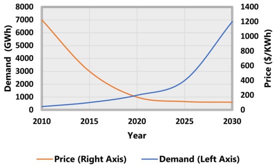These aforementioned factors triggered the development and widespread application of a variety of energy storage technologies, including nickel-metal hydride batteries (NiMH), lithium-ion batteries (Li-ion Battery), conventional lead-acid batteries (Pb-acid), and nickel-cadmium batteries (NiCd) [1]. If the target of the global Paris Climate Accords is to be met, batteries must undoubtedly be a crucial part of climate action. The adoption of new cutting-edge technologies has played a significant role in the steady rise in the use of batteries as power sources for portable electronics and electric vehicles over the past few decades. The rising demand is largely due to portable electronics like mobile phones and microcomputers. Due to their superior electrochemical performance in terms of power density, energy density, and long-lasting stability, Li-ion batteries are currently the most extensively deployed and consumed battery technology. It is anticipated that their use in the automotive industry will further increase demand for Li-ion batteries. This trend is depicted in Figure 1.