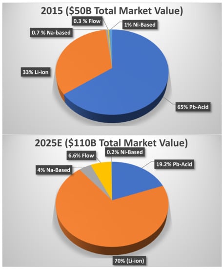 The Energy Sector Management Assistance Program (ESMAP) [2] reported that the Li-ion battery market grew from 5 billion US$ in 2005 to approximately US$18 billion in 2015, with a significant proportion of applications in electronic devices. The Li-ion battery market is extrapolated to reach over 75 billion US dollars in 2025, accounting for 70% of the market for rechargeable batteries, as indicated in Figure 2.