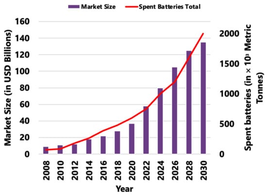 Global market size and total battery spent estimation of Li-ion batteries over the years (Data derived from refs. [1,2,23]).