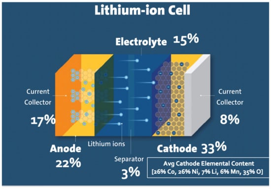 Figure 5 depicts a typical composition of a Li-ion battery. Table 1 shows the approximate value per metric ton (in the year 2022) for the key valuable components in a standard Li-ion battery technology [7]. Large-scale economic and non-complex Li-ion battery recycling will undoubtedly benefit the environment and the economy as more and more Li-ion batteries are produced and consumed [26]. As noted, active cathode materials contribute the largest share of the overall cost of the battery; hence, the emphasis on recycling should be primarily focused on the cathode component.