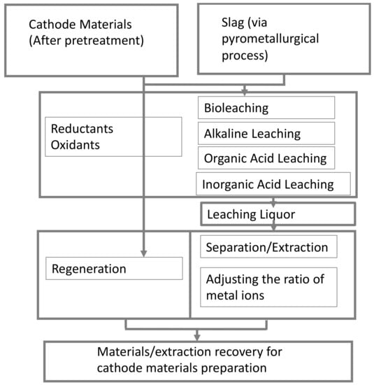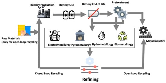 Spent Li-ion batteries are conventionally recycled by employing hydrometallurgy, pyrometallurgy, bio metallurgy or electrometallurgy or a combination of all or some of them at the industrial and pilot scale [28,29]. Figure 6 depicts a schematic representation of a typical recycling scheme, which typically entails four primary steps: pre-treatment, metal extraction, product and component refining, and battery production.