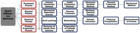 Shin et al. [31] developed a combination process that used mechanical separation to gather the active cathode materials and a hydrometallurgical procedure to recover valuable metals from the wasted Li-ion batteries. After a variety of mechanical processes, including crushing, sieving, and magnetic separation, enriched LiCoO2 particles were produced. These particles were then finely ground to separate the LiCoO2 from tiny fragments of aluminium foil. Prior to the metal-leaching process, mechanical separation can increase the efficiency of the targeted metal recovery. The main drawback of mechanical procedures is that the components of used Li-ion batteries cannot be entirely separated from one another. In addition, the environment is put in danger because of the disintegration of LiPF6, DEC, and PC during mechanical processes [52]. The process flow chart of the conventional mechanical treatment methodologies is depicted in Figure 8.