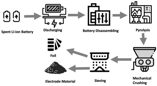 Vacuum pyrolysis is a straightforward method for extracting active cathode material. The pyrolysis process evaporates or breaks down the electrolyte and binder, which in turn weakens the active cathode material matrix-substrate bond [49,50,51]. The thermal treatment approach employs high temperatures to break down the binder, weakening the foil substrate-active cathode material bond. The active cathode materials can subsequently be effectively removed via physical separation processes (such as sieving, magnetic separation, crushing, etc.) [50].