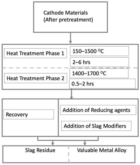 A subset of extractive metallurgy, pyrometallurgy employs heat to physically and chemically modify ore and concentrates in order to recover valuable metals [29,53]. In order to recover heavy metals (such as Cd, Pb, Cu, Zn, etc.) from depleted Ni-Cd batteries, Ni-Fe or Zn-Mn dry batteries, pyrometallurgical methods have been extensively researched [22,54]. In pyrometallurgical operations, smelt slags are frequently utilized to segregate metals, with certain metals going to the slag and the target metals becoming alloys. Most pyrometallurgical processes, with the exception of the Umicore technology, require pre-treatment processing [49,53,55,56]. By incorporating CaO + SiO2, pyrolusite, and minute amounts of Al shells into the processing of spent Li-ion batteries, Ren et al. [57] presented a novel slag system of MnO-SiO2-Al2O3. The mixture was then heated for 30 min at 1475 °C. This innovative technique produced a high-purity metallic alloy with Ni (99%), Co (99%), and Cu (99%), as well as enhanced slag with MnO (46%) and Li2O (2.5%) [22,57].