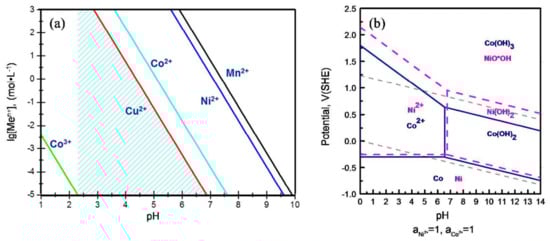 (a) Correlation between equilibrium aqueous metal ion concentration (at 25 °C) and pH; (b) Potential (E vs. SHE) and pH diagram for the Ni-H2O and Co-H2O systems (at 25 °C, Co = Ni = 0.2 mol L–1) (Figure adapted from ref. [22]).