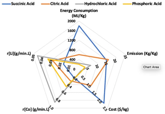 Li et al. [46] iterated that while the leaching efficiency of Li is consistently steady throughout those various leaching media, the leaching efficiency of Co is higher when employing citric acid compared to HCl or H2SO4. Most organic acids have a similar reaction mechanism to critic acid, with a few exceptions like oxalic acid [12,13,46,68]. Oxalic acid may serve as both a reductant and a leachant; consequently, Co and Li leaching could attain leaching efficiencies of more than 97% [12,13].
