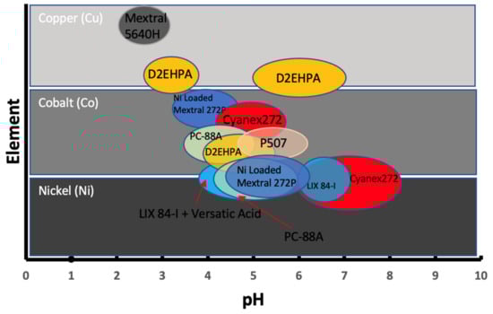 - Joo, S.-H.; Shin, D.J.; Oh, C.; Wang, J.-P.; Senanayake, G.; Shin, S.M. Selective Extraction and Separation of Nickel from Cobalt, Manganese and Lithium in Pre-Treated Leach Liquors of Ternary Cathode Material of Spent Lithium-Ion Batteries Using Synergism Caused by Versatic 10 Acid and LIX 84-I. Hydrometallurgy 2016, 159, 65–74. [Google Scholar] [CrossRef]