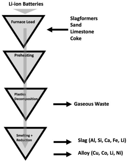 - Makuza, B.; Tian, Q.; Guo, X.; Chattopadhyay, K.; Yu, D. Pyrometallurgical Options for Recycling Spent Lithium-Ion Batteries: A Comprehensive Review. J. Power Sources 2021, 491, 229622. [Google Scholar] [CrossRef]