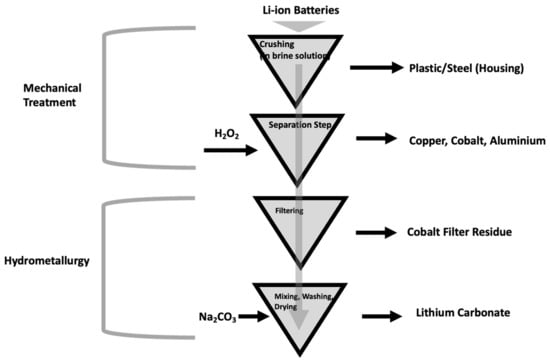 - Zou, H. Development of a Recycling Process for Li-Ion Batteries; Worcester Polytechnic Institute: Worcester, MA, USA, 2012. [Google Scholar]