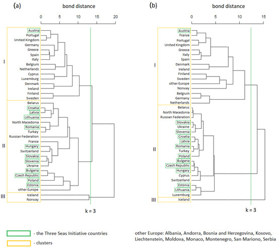 In the case of the overall energy market (Figure 1a), Ward’s method divides the countries surveyed into III clusters, of which the Three Seas Initiative countries (3SI) mostly belong to cluster II. With the exception of France and some smaller countries from “other Europe”, cluster II is made up of countries directly bordering the countries of the 3SI.