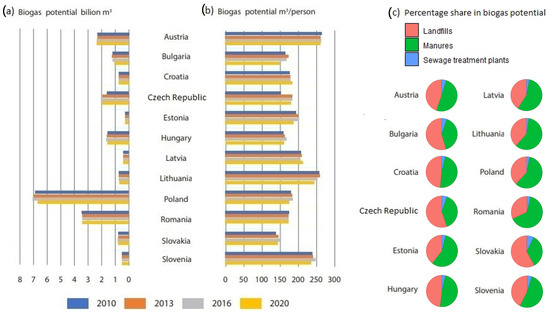 Biogas potential (a) per population (b) and with percentage share of individual sources at national level (c).
