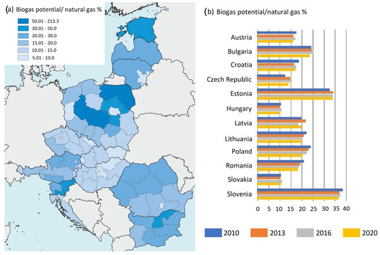 In this case, a scenario was examined in which all of the estimated biogas potential sources with a calorific value of 23 MJ/m3 [67] is used to replace natural gas consumption. For this purpose, estimated biogas potential was divided by the natural gas consumption taken from the BP database [68]. Calculation was provided on the NUTS 1 and NUTS 2 levels (Figure 3). In terms of covering gas consumption by biogas potential, Slovenia and Estonia were the leaders. In their case, biogas potential could cover 36.8% and 34.0% of natural gas demand in 2021, respectively. By contrast, in Slovakia and Hungary, biogas potential would only cover 10.6% and 10.2% of natural gas consumption, respectively (Figure 3b). It is worth noting that the significance of biogas potential steadily declined over the studied period from 2010–2021. In 2010, it was able to cover an average of 19.8% of the natural gas demand in the 3SI countries, while in 2020 it was more than 17.6%. This phenomenon is mainly due to an increase in natural gas consumption among the 3SI countries and to a lesser extent to fluctuations in biogas potential (Figure 2a).
