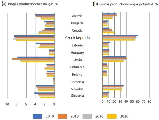 In natural units, the Czech Republic remains the leader in biogas production among the 3SI countries (24,500 TJ in 2021). Poland, with annual production of 13,051 TJ in 2021, is ranked second [83]. The biogas produced in the 3SI countries is mainly used for the production of electricity and heat in cogeneration facilities, while biomethane plants that can feed into the local gas grid are still rare [84,85]. However, when comparing biogas production to natural gas consumption, it can be seen that biogas plays the greatest role in the Czech Republic and Latvia, where it would be able to cover more than 8.1% and 7.1% of natural gas demand in 2020, respectively (Figure 4a). It is worth noting that the utilisation rate of biogas production potential also reaches high values in the Czech Republic ~54.9% and Latvia ~35.6% in 2020 (Figure 4b). In the case of Poland, biogas production would be able to cover just over 1.7% of natural gas consumption, which also translates into a low utilisation rate of production potential (only 7.9% in 2020). Romania remains the country where biogas production plays the smallest role (only ~0.2% compared to natural gas consumption in 2020), with a very low production potential utilisation rate of ~1.1%.