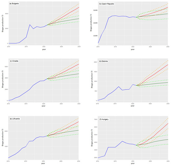 The results seen in Figure 5 marked by red and green curves show a strong variation among the countries studied in terms of projected growth in biogas production. The confidence interval (Lo–Hi) of a forecast (dashed curves) is the range within which the value we forecast will lie with a probability of 95%.