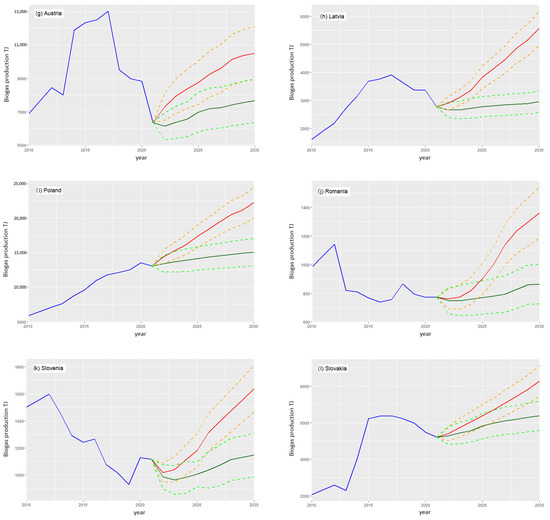 Of the countries studied, the largest percentage increase in production between 2022 and 2030 is projected for Estonia at 138.7% in 2030 compared to 2021 (Figure 5d—red curve). This is primarily due to one of the fastest projected GDP growth rates among the 3SI countries [100] and a low utilisation rate of biogas production potential (~10% in 2020, Figure 4b). A very strong percentage increase in biogas production is also forecasted for Latvia (101.3% in 2030 compared to 2021). However, in the case of Latvia, the period from 2022–2026 will be mainly managed to rebuild 2017 production levels (Figure 5h—red curve). High production growth (~96.1%) is also projected for Bulgaria. For the countries with the highest biogas production potential, Poland and Romania, the projected growth will be 70.3% and 76.6%. However, in the case of Romania, the period from 2022–2027 will be dedicated to rebuilding the 2012 production level (Figure 5j—red curve). The lowest growth in biogas production (~32.4%) is projected for the Czech Republic. This is a result of one of the smallest (among the 3SI countries) projected GDP growth rates [100] and a high degree (~55%) of biogas production potential utilisation (Figure 5b—red curve).