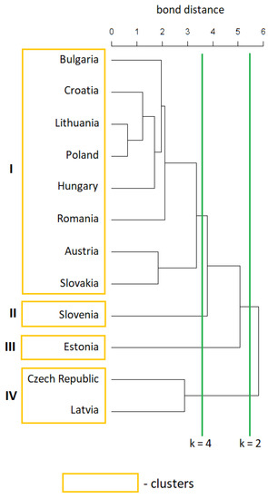 By observing biogas production and the projected growth until 2030, it can be seen that in this respect, the 3SI countries show some similarities. Figure 6 shows a dendrogram obtained using Ward’s agglomeration method. It shows the results of the clustering based on the similarities between the indicators of biogas production against natural gas consumption, biogas potential against natural gas consumption, biogas production against biogas potential, and the projected increase in production value of the period from 2022–2030. In this case, the clustering quality measure Silhouette Index indicates a division into two clusters (k = 2) as the optimal number, but a division into four clusters (k = 4) was used to better represent the clustering.