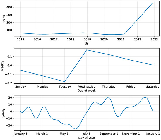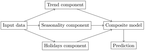 Facebook Prophet is a time series data forecasting tool created by Facebook’s Core Data Science team. It is constructed on top of the open-source programming language R and is intended to be simple to use while producing credible forecasts, according to [63]. The Prophet technique is based on the assumption that time series data can be described as a mixture of numerous characteristics, such as trends, seasonality, and holidays [64]. The math powering Facebook Prophet entails identifying and modeling these components using a number of mathematical and statistical methodologies: (i) linear regression is used to model the trend component of a time series; (ii) Fourier series are used to model the seasonality component of a time series; and (iii) additive models are used to describe the holidays component of a time series.