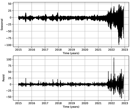 When the time window is increased, the error signal (residual) increases until it reaches its maximum (in this evaluation) at 365 observations (at which point predictions are ineffective, since the MAPE error is 58.96%). When 1095 observations are used (3 years), lower error values are found, and within this perspective, an optimization analysis could be performed to determine the optimal number of observations. Since the purpose of this paper was to evaluate the complete variation history to assess the seasonality of the variations, this was not performed. Figure 8 shows the use of STL to filter the signal and Prophet to perform the forecast considering 90 observations.