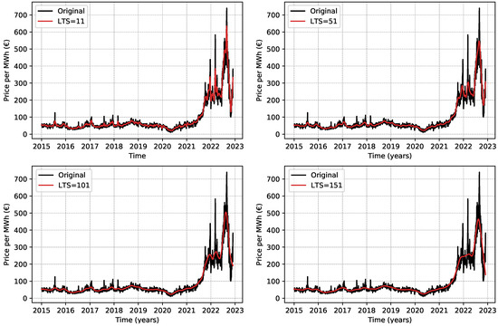Considering these variations, the trend value was analyzed, this value was used in this paper as the observed value to forecast the electricity price. To use the trend from the STL, it is necessary to define two parameters which are the length of the seasonal smoother (LSS) and the length of the trend smoother (LTS). The results of the STL decomposition analysis are presented in Figure 4 in relation to the LTS of the time series. The variation of the value of LSS did not result in a visual change; for this reason, these results are not presented in graphical form.