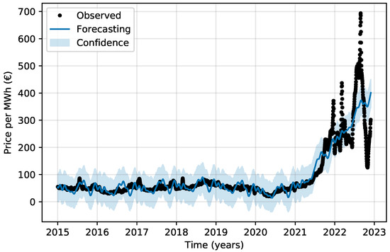 Several authors have been researching this subject in recent years. Various approaches based on artificial intelligence paradigms—mainly machine learning and deep learning—have been designed to forecast the price of energy [3,4,5]. Before the deregulation of electricity markets, spot price forecasts were laborious and detailed [6]. They were based on estimating the future market forecast based on historical data, calculating supply by adding the operating costs of generating units, and by comparing supply and demand. Thus, cost-based models were reliable tools for forecasting electricity spot prices and required negligible changes. However, currently, such models are outdated, and unfortunately, the models implemented at present for electricity spot prices are not yet accurate enough [3].