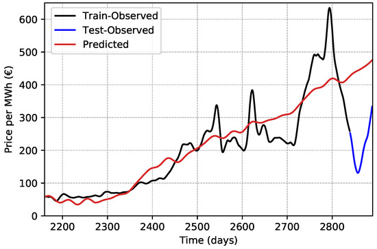 The evaluation of a short period of time results in a lower forecast error of the model in view of the fact that the predictions only take into account momentary variations, and do not consider the seasonal variations of the market. In this sense using the entire dataset (with 2890 observations) is more challenging. Still, it results in an appropriate reflection of the price variation, and the energy cost scenario compared to previous years.