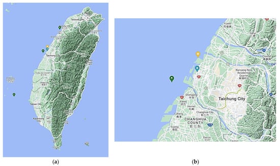 (a)The position of the buoys, Wuqi station, and met mast. The green tags from north to south are the Hsin Chu, Tai Chung, and Ci Mei buoys, respectively. The blue tag is Wuqi Station, and the yellow tag is the BSMI met mast. (b) Surface observation sites around central Taiwan.