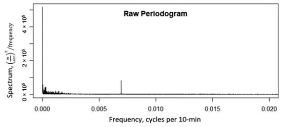 The periodogram of the 10-min average wind speed at a 100 m height of the met mast shows two peak frequencies in Figure 4. They correspond to the periods of 352 days and 1 day, respectively []. Considering the relatively short observation period, we chose to set two periodic components with periods of 365 days and 1 day, respectively.