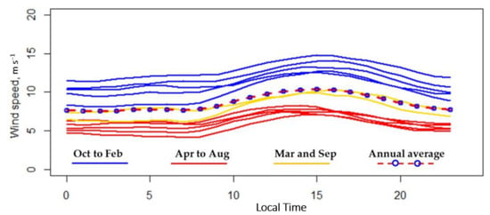 Furthermore, we analyzed the monthly diurnal variation pattern by calculating each month’s average wind speed for individual hours []. The wind speed diurnal variation patterns of individual months and their annual average are depicted in Figure 5. Although there seems to be a typical diurnal variation pattern with wind speed peaks in the afternoon, the hours of peak occurrence of the high wind speed months (October to February) are about 2 to 3 h later than that of the low wind speed months (April to August). The windspeed variation range is more significant in the high wind speed season than in the low wind speed season.