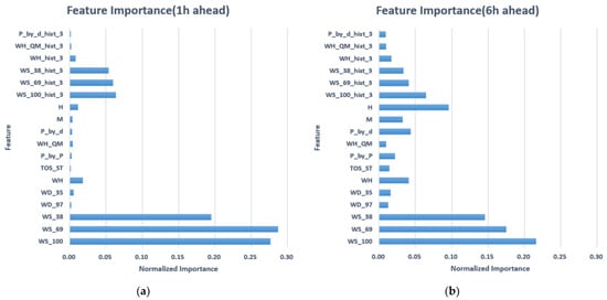 Feature importance of different predicting periods. (a) Feature importance of one hour ahead. (b) Feature importance of 6 h ahead.