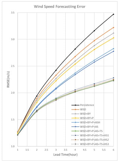 As shown in Figure 7, the root mean square error (RMSE) of WS_100 was used as the error measure metric. Then, according to the importance and correlation of features, they were grouped and added to the prediction model of random forests step by step to determine the contribution of each feature group. Notations used for the grouped features are listed in Table 2. Table 3 tabulates data plotted in Figure 7.