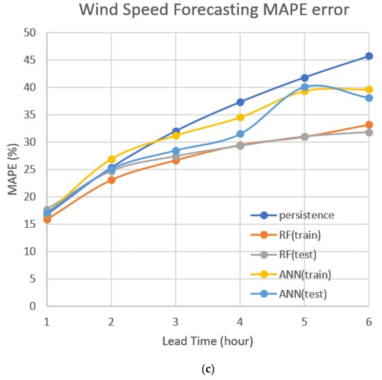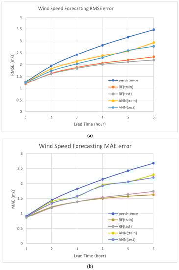 - As shown in Table 5, with a lead time of one hour, the MAPE of the RF (test) was worse than that of the persistence model, but the RMSE and MAE of the RF (test) were better than that of the persistence model. These may have been caused by error distribution. In the prediction of the RF model, there may have been larger absolute errors in the low wind speed interval, resulting in a larger MAPE obtained by dividing by the low wind speed (small denominator).