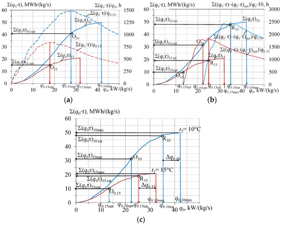 Specific annual refrigeration energy consumption ∑(q0 ∙τ), optimum q0.opt and rational q0.rat values of specific refrigeration capacities while cooling ambient air to 10 and 15 °C in southern Ukraine (temperate climate), 2017: (a) determining of q0.opt; (b) determining of q0.rat; (c) generalized graphs for q0.opt and q0.rat; Δq0.10 = q0.10max − q0.10rat and Δq0.15 = q0.15max − q0.15rat.