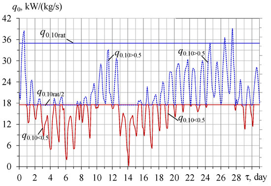A lack of loading within the unregulated range q0.10 ˂ q0.10rat/2 is considered as exceeding q0.10rat/2ex˂0.5 = q0.10rat/2 − q0.10˂0.5 of the rational designed value of refrigeration capacity q0.10rat/2 = q0.10rat/2 over the actual loads marked as q0.10˂0.5 (Figure 4).