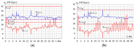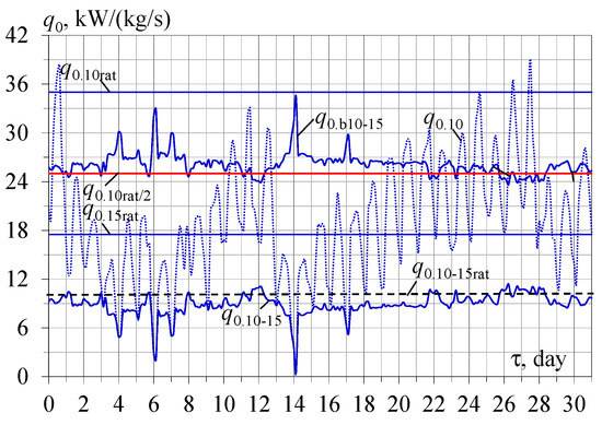 As is seen from Figure 2a, when conditioning outdoor air to 10 °C, the thermal load fluctuations are great and follow their values for preconditioning outdoor air to 15 °C, which results in practically unchangeable refrigeration capacities q0.10–15 for subsequent air conditioning from 15 to 10 °C. Issuing from the total designed rational value q0.10rat and practically unchangeable part q0.10–15 ≈ q0.10rat − q0.15rat (Figure 1), the remainder of the total value q0.10rat as the booster one q0.b10–15 = q0.10rat − q0.10–15 is available for preconditioning outdoor air to 15 °C.