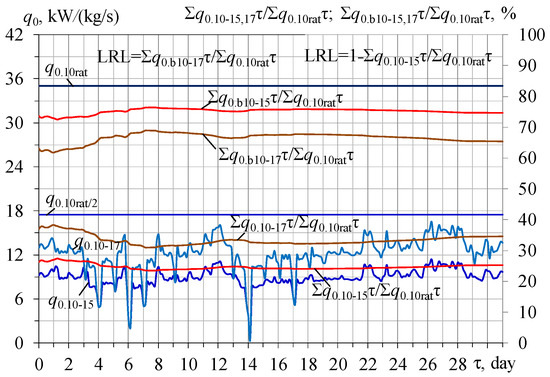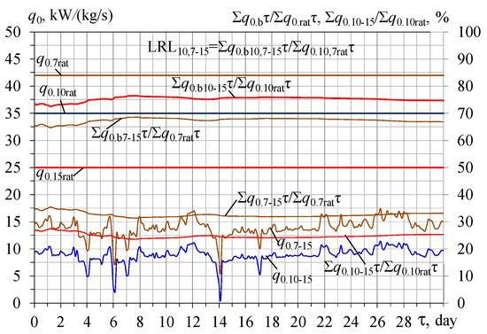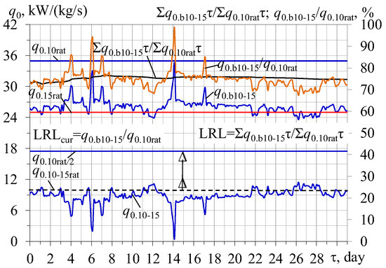 Thus, the required level of regulated load LRL10–15 can be determined indirectly by using the comparatively stable load: LRL10–15 = 1 − ∑(q0.10–15 τ)/∑(q0.10ratτ) as a trend line of the current values LRL10–15cur = 1 − q0.10–15/q0.10rat (Figure 8).