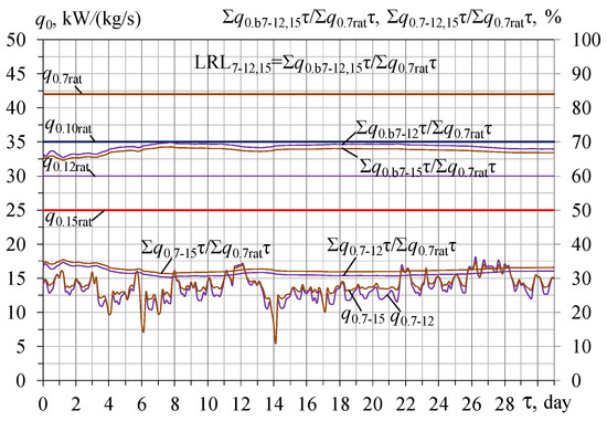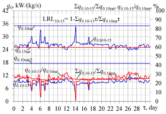With this, the lack of thermal loads, characterized by the values of exceedance of rational refrigeration capacity q0.10rat/2ex above the actual thermal loads q0.10˂0.5 within a range without refrigeration capacity regulation (Figure 4), is reflected by corresponding increments of the rest booster thermal loads q0.b10–15 (Figure 8), based on which the current LRL10–15cur and summarized LRL10–15 values are calculated.