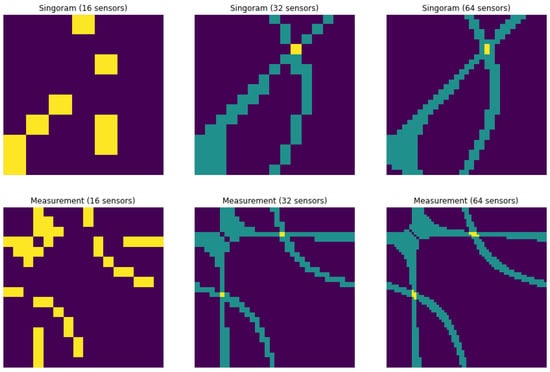 The sinograms (top row) calculated from the measurements (bottom row) for the case of 16, 32, and 64 sensors.
