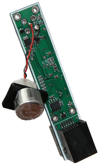 The tomograph has full responsibility for controlling the measurement sequence, and active measurement probes, and for capturing and collecting data. The active probe of the ultrasound tomograph uses a single piezoelectric transducer for measurement in the absorption mode. This transducer shown in Figure 4, with a resonant frequency of 40 kHz, functions as an ultrasound transmitter and receiver. External transducers can be connected to the circuit board via the SMB socket (e.g., transducers immersed in the medium or permanently attached to the tank or pipe). The probe incorporates a microcontroller with integrated signal processing and an A/C converter. Using a programmable digital potentiometer, each probe can adjust the amplification of the received signal.